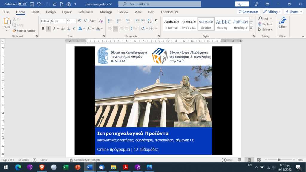 Tο Εθνικό και Καποδιστριακό Πανεπιστήμιο Αθηνών (ΕΚΠΑ) και το Εθνικό Κέντρο Αξιολόγησης της Ποιότητας & Τεχνολογίας στην Υγεία (ΕΚΑΠΤΥ) προσφέρουν για πρώτη φορά ένα πλήρες, εξ αποστάσεως, εκπαιδευτικό πρόγραμμα εξειδίκευσης στα Ιατροτεχνολογικά Προϊόντα (Medical Devices). Η Βιοϊατρική Τεχνολογία αποτελεί τομέα αιχμής με υψηλή ζήτηση στην αγορά εργασίας και απαιτεί σύγχρονες επαγγελματικές γνώσεις και δεξιότητες.