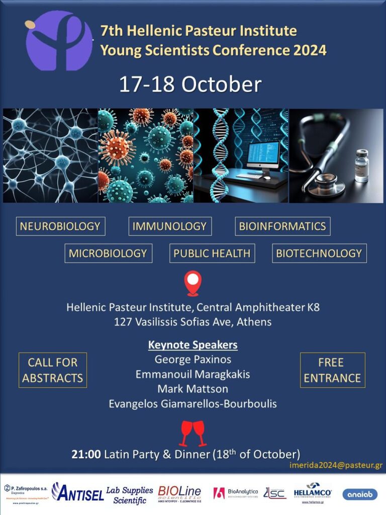 Με χαρά σας προσκαλούμε να υποβάλετε τις ερευνητικές σας εργασίες μέχρι 20 Σεπτεμβρίου 2024 για παρουσίαση στο 7ο Συνέδριο Νέων Επιστημόνων του Ελληνικού Ινστιτούτου Παστέρ, το οποίο θα πραγματοποιηθεί στις 17-18 Οκτωβρίου 2024 στο Ελληνικό Ινστιτούτο Παστέρ. Το συνέδριο αυτό αποτελεί μια εξαιρετική ευκαιρία για να παρουσιάσετε την έρευνά σας και να αλληλεπιδράσετε με συναδέλφους επιστήμονες στους τομείς της νευροβιολογίας, ανοσολογίας, μικροβιολογίας, δημόσιας υγείας, βιοτεχνολογίας/δομικής βιολογίας και βιοπληροφορικής. Οι καλύτερες παρουσιάσεις και πόστερ θα βραβευτούν στην τελετή λήξης.