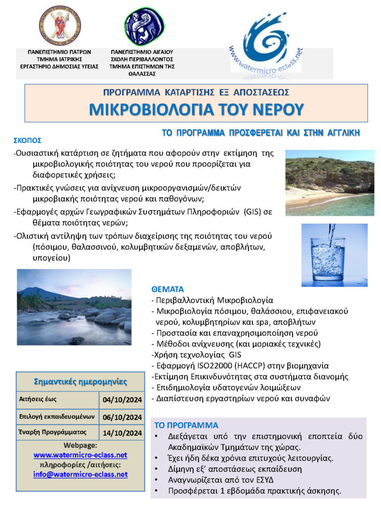 Για να καλυφθούν αυτές οι ανάγκες σχεδιάσαμε ένα τρίμηνης διάρκειας (14 εβδομάδων) Πρόγραμμα Κατάρτισης για νέους επιστήμονες και επαγγελματίες που δραστηριοποιούνται στη μικροβιολογία του νερού, οι οποίοι επιθυμούν να εμπλουτίσουν τις γνώσεις και την τεχνική τους επάρκεια.