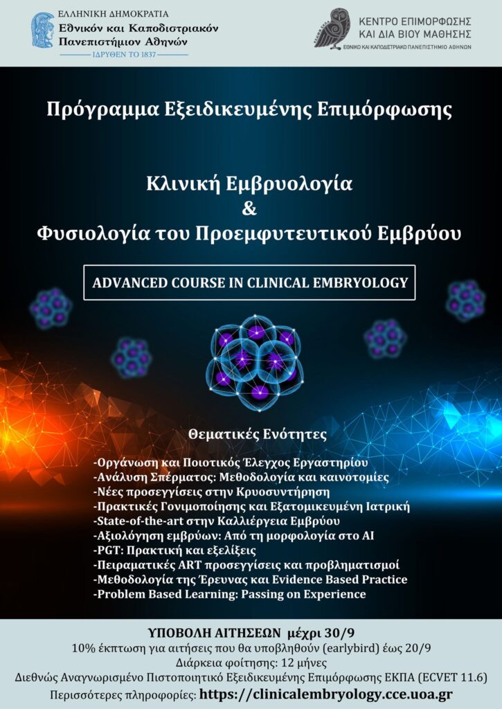 Με ιδιαίτερη χαρά σας ανακοινώνουμε την έναρξη του “Προγράμματος Εξειδικευμένης Επιμόρφωσης στην Κλινική Εμβρυολογία και στην Φυσιολογία του Προεμφυτευτικού Εμβρύου’’. Στόχος μας, να γνωρίσουμε τον μεγάλο πρωταγωνιστή: δηλαδή το έμβρυο, κατανοώντας σε βάθος τη φυσιολογία, τις ανάγκες, τη συμπεριφορά και το δυναμικό του!