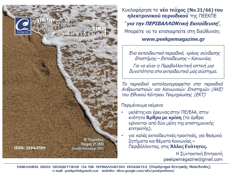 ΚΥΚΛΟΦΟΡΗΣΕ Το νέο ηλεκτρονικό τεύχος 21 (66) του περιοδικού της ΠΕΕΚΠΕ. “Για την Περιβαλλοντική Εκπαίδευση” το οποίο μπορείτε να βρείτε ΕΔΩ.