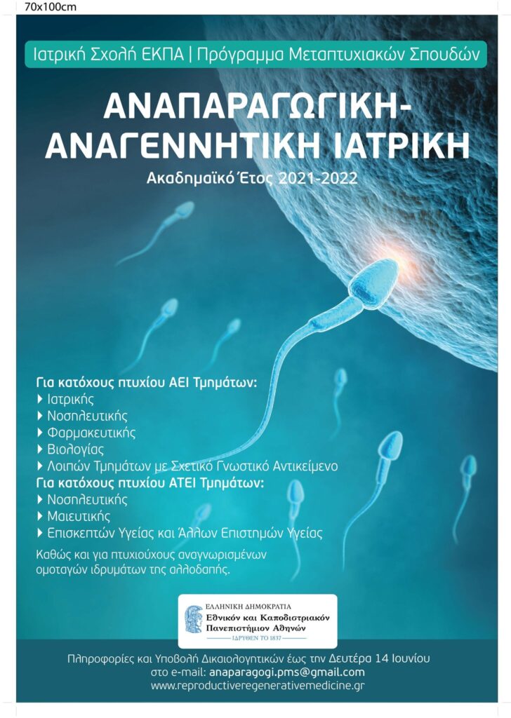 Το ΠΜΣ «Αναπαραγωγική – Αναγεννητική Ιατρική» καλύπτει ένα σημαντικό τομέα ιατρικής εκπαίδευσης στη χώρα μας. Αντικείμενο και σκοπός του είναι η παροχή υψηλού επιπέδου εξειδίκευσης και η εξάσκηση στη διεξαγωγή έρευνας στην Αναπαραγωγική Ιατρική αποφοίτων Ιατρικών και άλλων Σχολών Υγείας και Σχολών Βασικών Επιστημών. Οι εκπαιδευόμενοι θα πρέπει να συνδυάζουν υψηλού επιπέδου ικανότητες τόσο σε ακαδημαϊκό όσο και ερευνητικό επίπεδο με στόχο να αποκτήσουν επιπλέον θεωρητική και πρακτική γνώση που θα βοηθήσει στην επιτυχή επαγγελματική σταδιοδρομία και αποκατάσταση στον ιδιωτικό και δημόσιο τομέα.