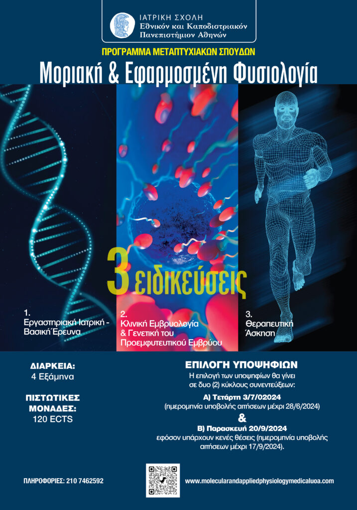Η Ιατρική Σχολή του Πανεπιστημίου Αθηνών, προκηρύσσει το Πρόγραμμα Μεταπτυχιακών Σπουδών (ΠΜΣ) με τίτλο: «Μοριακή και Εφαρμοσμένη Φυσιολογία» για το Ακαδημαϊκό Έτος 2024-2025, σύμφωνα με τις προϋποθέσεις που προβλέπει ο νόμος.