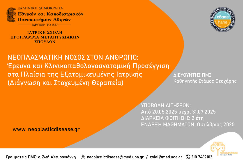 Η Ιατρική Σχολή του Εθνικού και Καποδιστριακού Πανεπιστημίου Αθηνών ανακοινώνει τη συνέχιση της λειτουργίας του Προγράμματος Μεταπτυχιακών Σπουδών (ΠΜΣ) το οποίο οδηγεί στην απόκτηση Διπλώματος Μεταπτυχιακών Σπουδών (ΔΜΣ) στη «Νεοπλασματική Νόσος στον Άνθρωπο: Έρευνα και Κλινικοπαθολογοανατομική Προσέγγιση στα Πλαίσια της Εξατομικευμένης Ιατρικής (Διάγνωση και Στοχευμένη Θεραπεία)» για το ακαδημαϊκό έτος 2025/26.