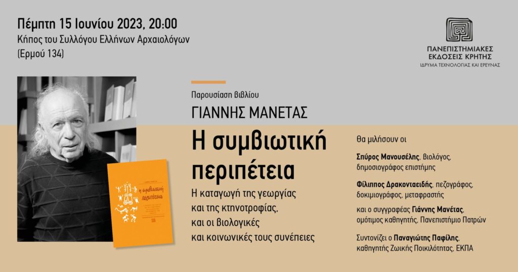 Οι Πανεπιστημιακές Εκδόσεις Κρήτης σας προσκαλούν στην παρουσίαση του βιβλίου του βιολόγου Ομ. Καθηγητή Γιάννη Μανέτα «Η συμβιωτική περιπέτεια. Η καταγωγή της γεωργίας και της κτηνοτροφίας, και οι βιολογικές και κοινωνικές τους συνέπειες».